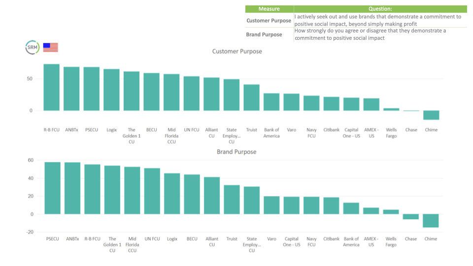 The same gap between the UK and the US goes for customer purpose and brand purpose. In the UK only Triodos customers overall seek out brands that demonstrate a commitment to positive social impact and also feel that Triodos is actually making an impact. Customers of Co-op Bank believe, too, that it has a strong brand purpose (though their customers don’t prioritise it to the same extent).